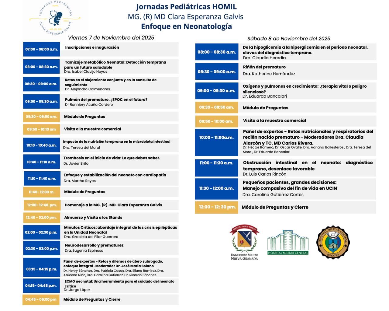 En el Auditorio Jorge Esguerra del Hospital Militar Central de Bogotá, se desarrollarán las Jornadas Pediátricas HOMIL Clara Esperanza Galvis, un evento en homenaje a la Pediatra Neonatóloga, excoordinadora del programa de Especialización en Pediatría en esta sede de la Universidad Militar Nueva Granada y Mayor General (R). La cita es el 7 y 8 de noviembre de 2025 con previa inscripción de manera gratuita y el enfoque será en neonatología.